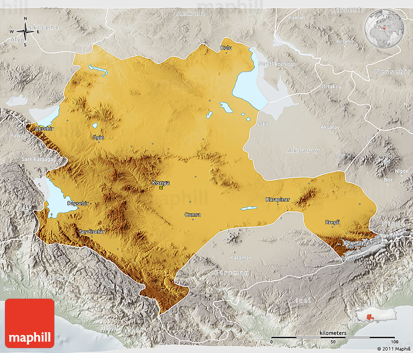 Physical map illustrates the mountains, lowlands, oceans, lakes and rivers and other physical landscape features of Konya. Differences in land elevations relative to the sea level are represented by color.