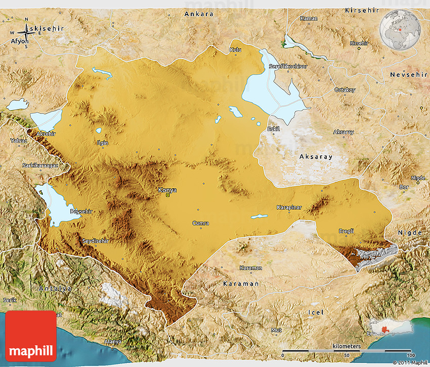 Physical map illustrates the mountains, lowlands, oceans, lakes and rivers and other physical landscape features of Konya. Differences in land elevations relative to the sea level are represented by color.