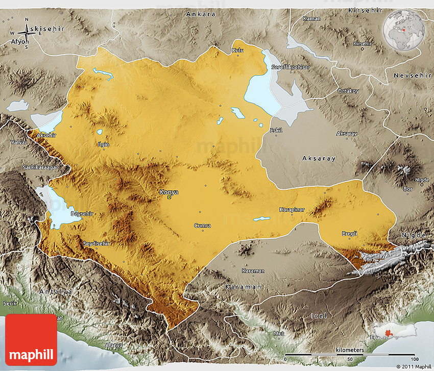 Physical map illustrates the mountains, lowlands, oceans, lakes and rivers and other physical landscape features of Konya. Differences in land elevations relative to the sea level are represented by color.