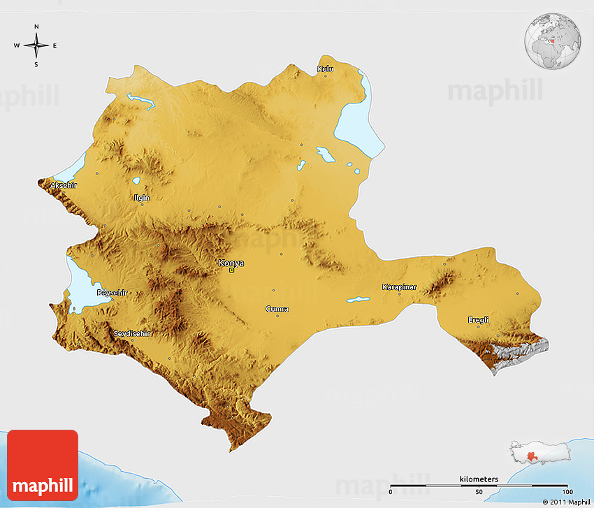 Physical map illustrates the mountains, lowlands, oceans, lakes and rivers and other physical landscape features of Konya. Differences in land elevations relative to the sea level are represented by color.
