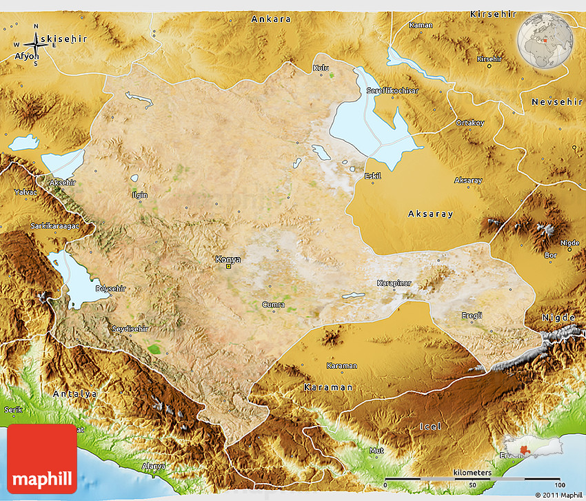 Physical map illustrates the mountains, lowlands, oceans, lakes and rivers and other physical landscape features of Konya. Differences in land elevations relative to the sea level are represented by color.