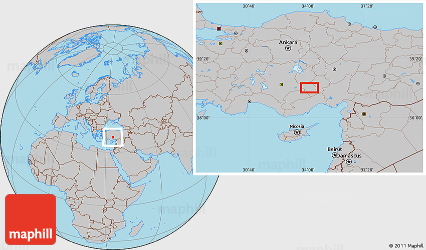 Maphill is a collection of map images. This image combines a gray map with the globe centered on Acıpınar. Use the buttons under the image to switch to different map types.