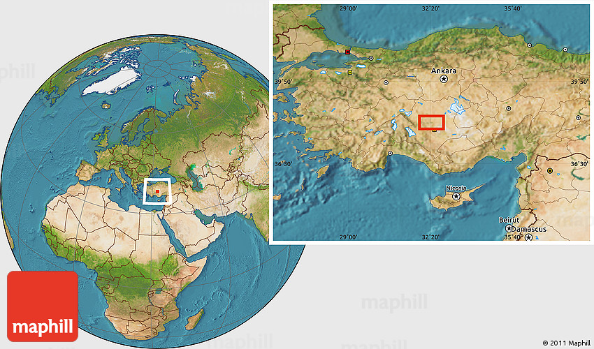 Maphill is a collection of map images. This image combines a satellite map with the globe centered on Karayörüklü. Use the buttons under the image to switch to different map types.