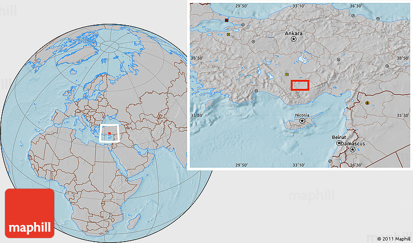 Maphill is a collection of map images. This image combines a gray map with the globe centered on Kuzucu. Use the buttons under the image to switch to different map types.