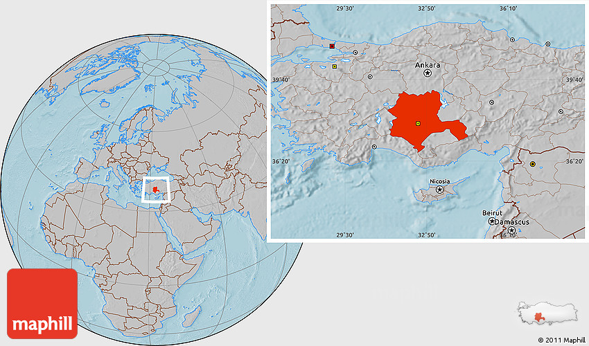 Maphill is a collection of map images. This image combines a gray map with the globe centered on Konya. Use the buttons under the image to switch to different map types.