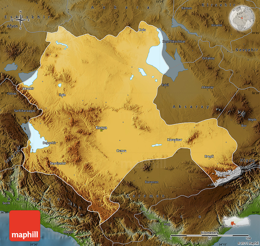 Physical map illustrates the mountains, lowlands, oceans, lakes and rivers and other physical landscape features of Konya. Differences in land elevations relative to the sea level are represented by color.