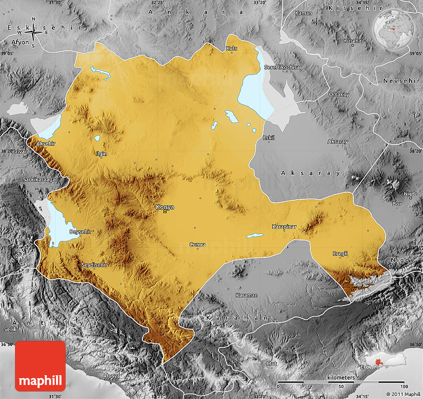 Physical map illustrates the mountains, lowlands, oceans, lakes and rivers and other physical landscape features of Konya. Differences in land elevations relative to the sea level are represented by color.