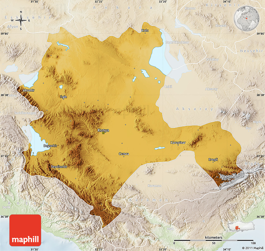 Physical map illustrates the mountains, lowlands, oceans, lakes and rivers and other physical landscape features of Konya. Differences in land elevations relative to the sea level are represented by color.
