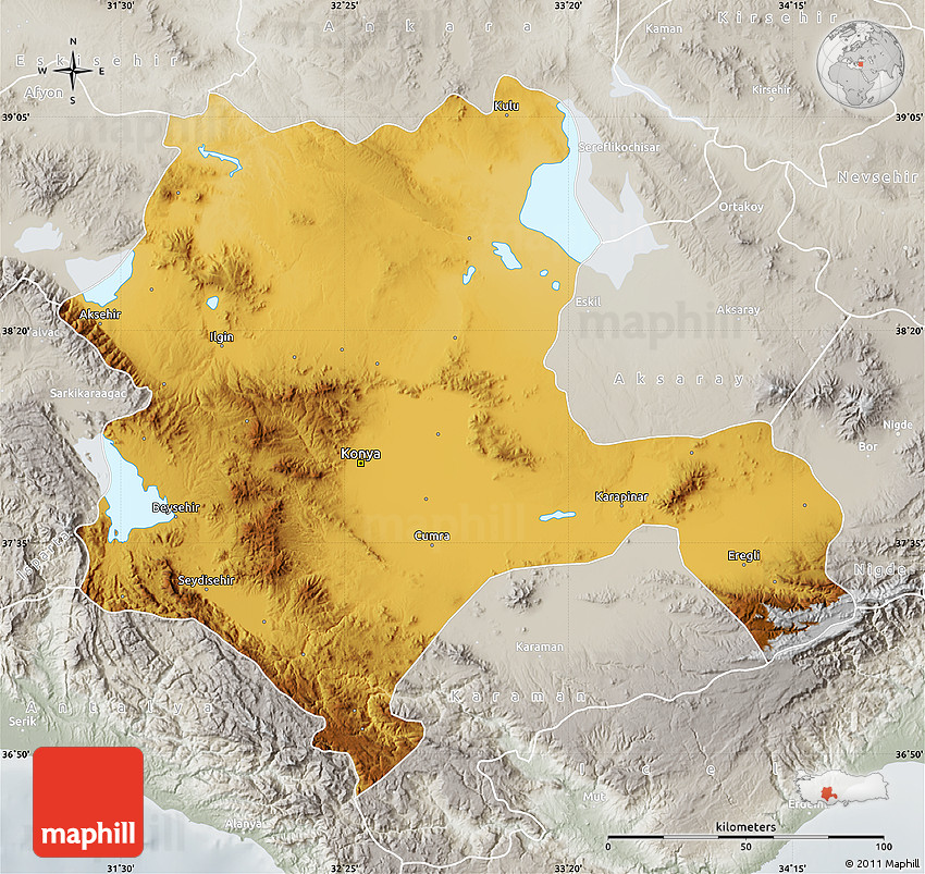 Physical map illustrates the mountains, lowlands, oceans, lakes and rivers and other physical landscape features of Konya. Differences in land elevations relative to the sea level are represented by color.
