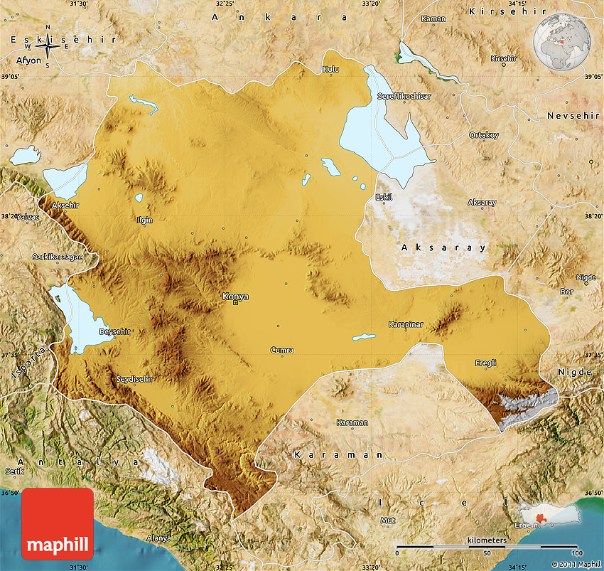 Physical map illustrates the mountains, lowlands, oceans, lakes and rivers and other physical landscape features of Konya. Differences in land elevations relative to the sea level are represented by color.