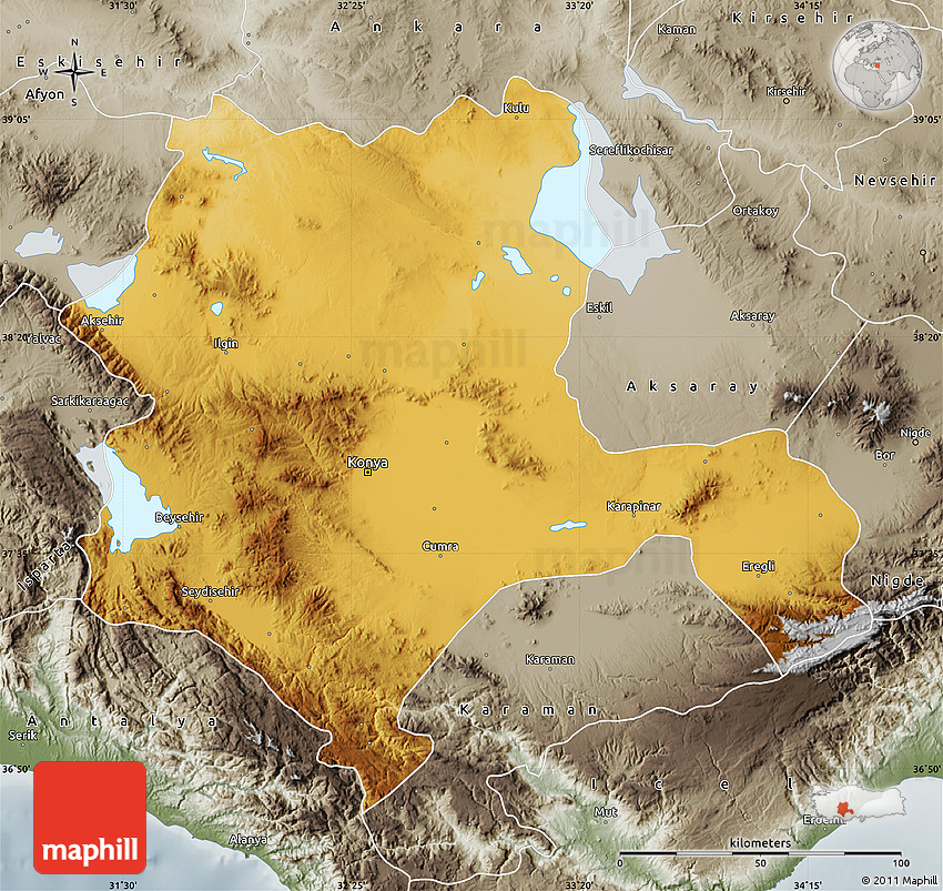 Physical map illustrates the mountains, lowlands, oceans, lakes and rivers and other physical landscape features of Konya. Differences in land elevations relative to the sea level are represented by color.