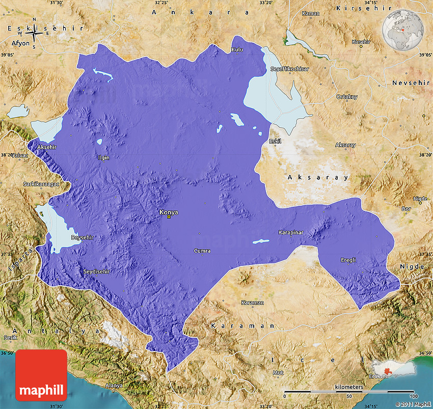 Each map type offers different information and each map style is designed for a different purpose. Read about the styles and map projection used in the above map (Political Map of Konya, satellite outside).