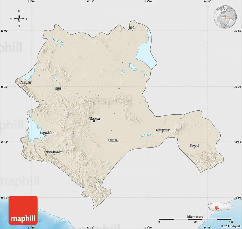 Shaded relief map shows landscape features, such as mountains, valleys and plateaus. Flat areas are smooth on the map, areas with steep slopes and mountains appear more rough. The above map of Konya was created using a digital elevation model.