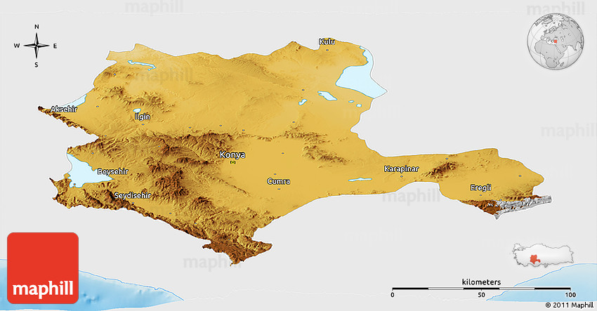 The panoramic physical map represents one of many map types and styles available. Look at Konya from different perspectives.