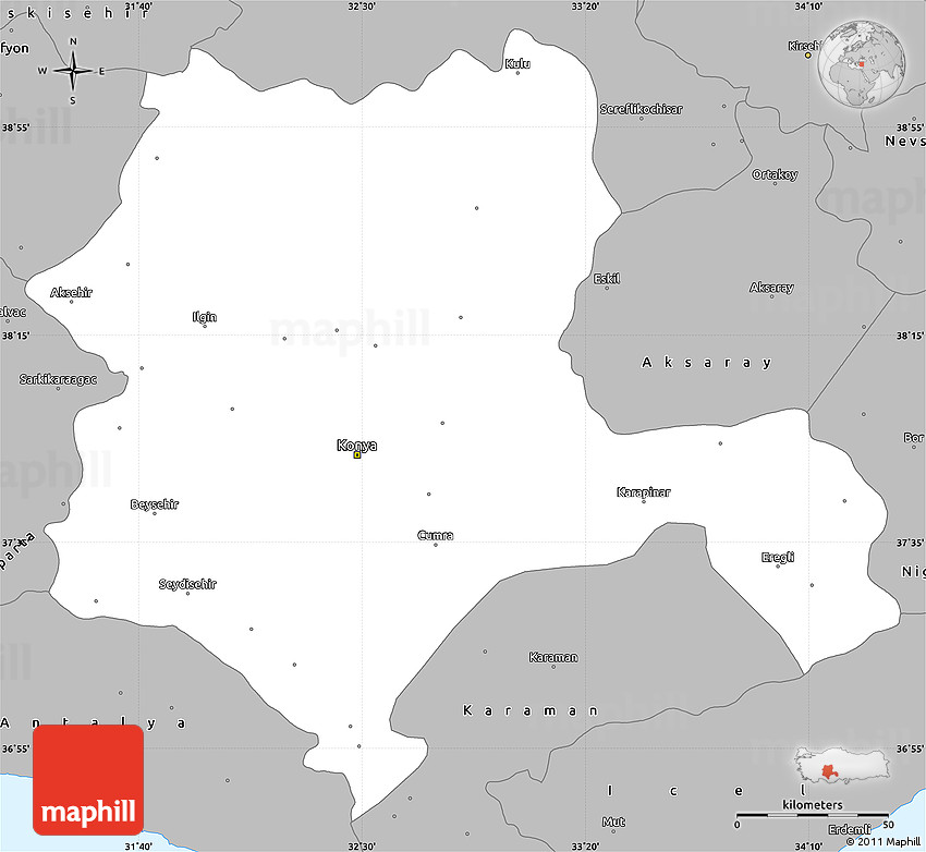 Embed the above gray simple map of Konya into your website. Enrich your blog with quality map graphics. Make the web a more beautiful place.