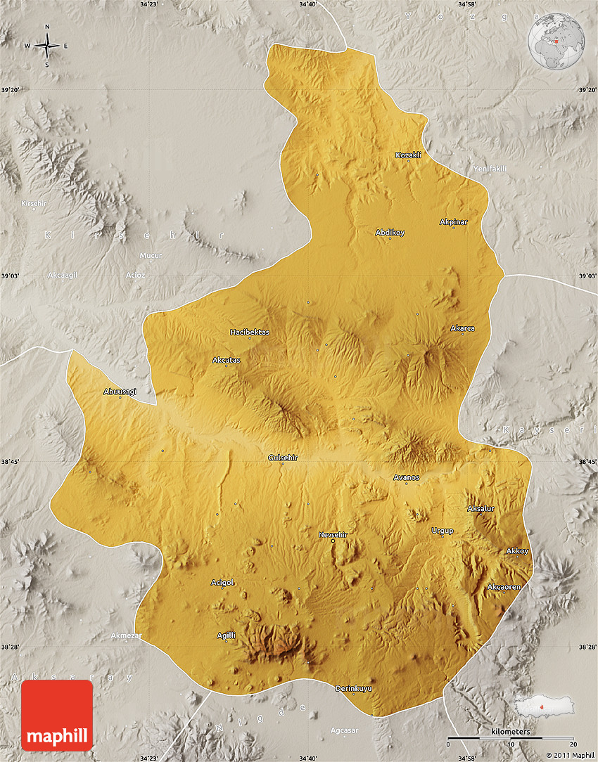 Physical map illustrates the mountains, lowlands, oceans, lakes and rivers and other physical landscape features of Nevsehir. Differences in land elevations relative to the sea level are represented by color.