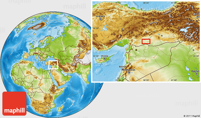 Maphill is a collection of map images. This image combines a physical map with the globe centered on Kanlıavşar. Use the buttons under the image to switch to different map types.