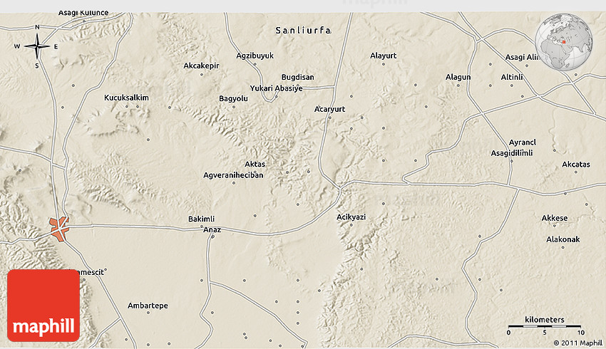 The 3D shaded relief map represents one of many map types and styles available. Look at Karabayır, Sanliurfa, Turkey from different perspectives.