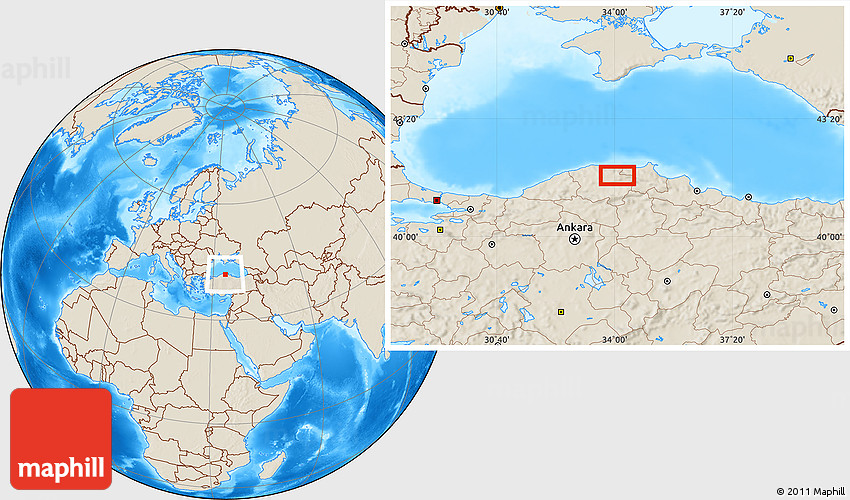 Maphill is a collection of map images. This image combines a shaded relief map with the globe centered on Düzköy. Use the buttons under the image to switch to different map types.