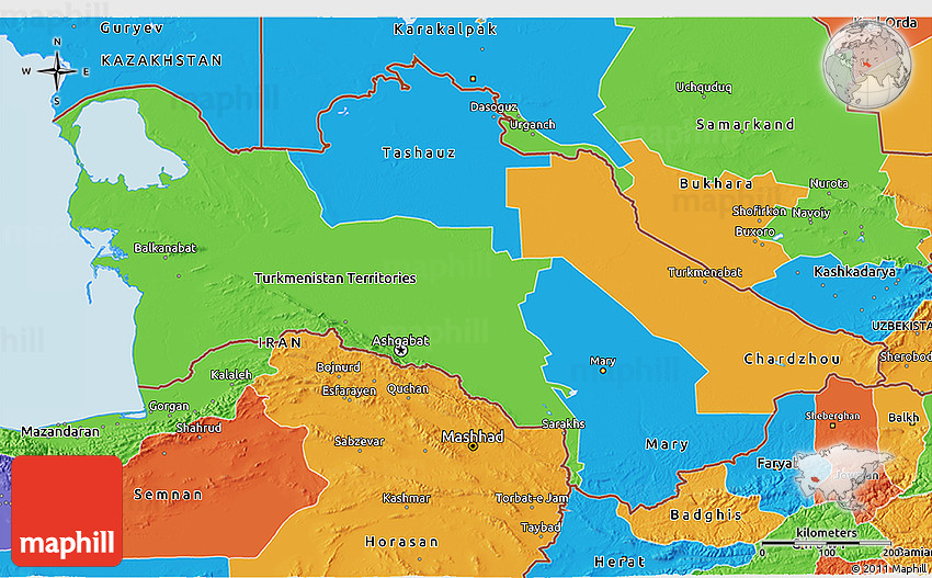 The 3D political map represents one of many map types and styles available. Look at Turkmenistan from different perspectives.