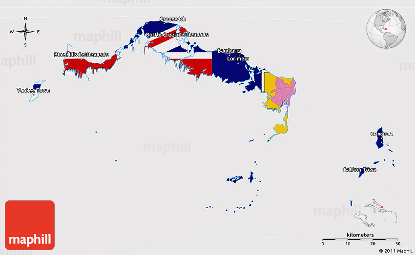 Flag map shows the flag of Turks and Caicos Islands clipped inside the country's borders. Flag image is resized to match the width and height of the country's outline. Maphill flag maps are more precise than often used flag clip art illustrations.
