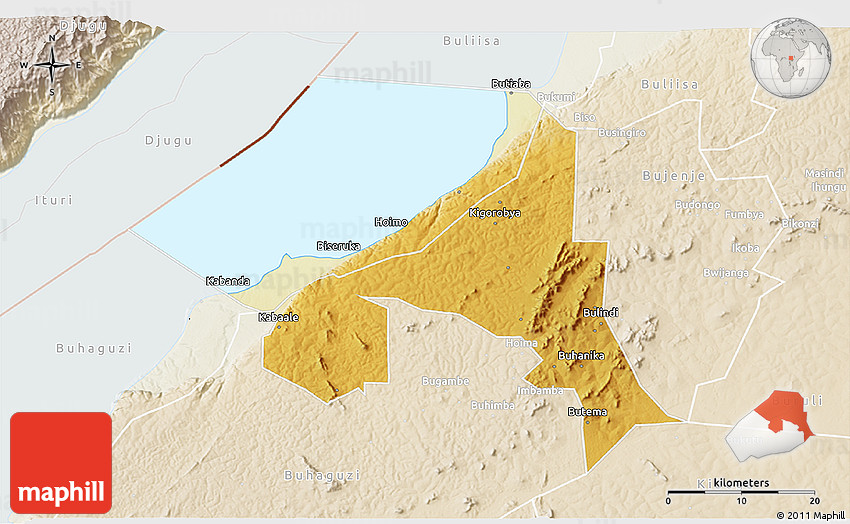 The 3D physical map represents one of several map types and styles available. Look at Bugahya, Hoima, Uganda from different perspectives.