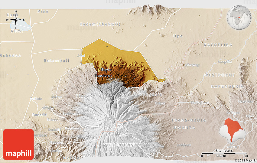 Maphill is a collection of map images. This view of Kween at an angle of 60° is one of these images. Click on the Detailed button under the map for a more comprehensive map.