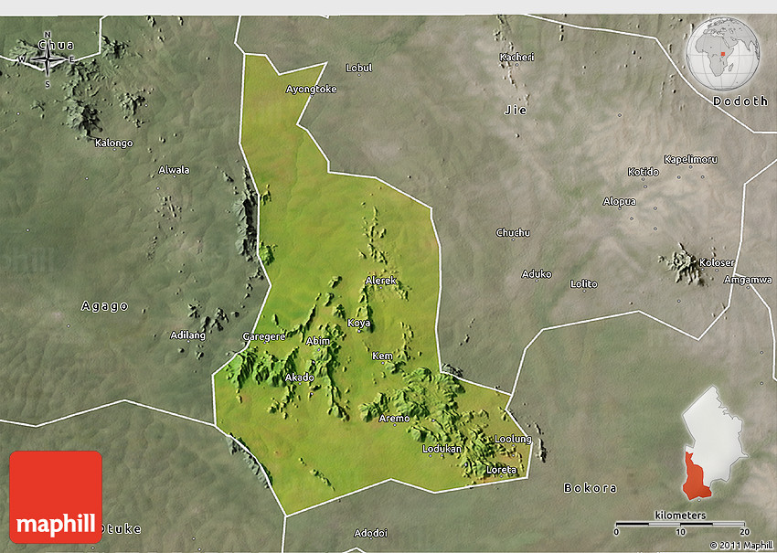 The 3D satellite map represents one of several map types and styles available. Look at Labwor, Kotido, Uganda from different perspectives.