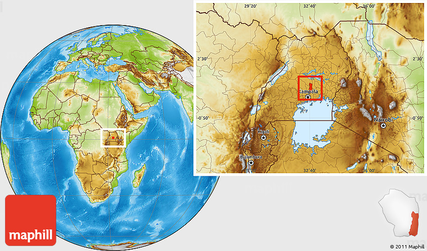 Maphill is a collection of map images. This image combines a physical map with the globe centered on Wabusana (Bamunanika). Use the buttons under the image to switch to different map types.