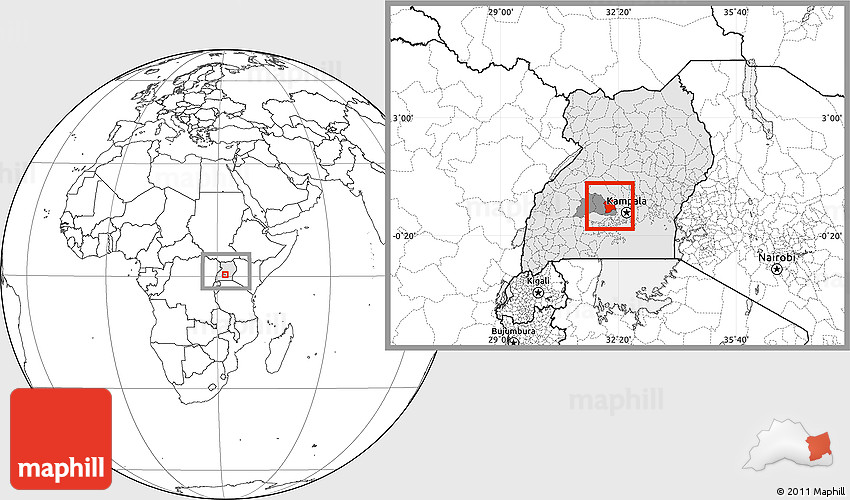 Maphill is a collection of map images. This image combines a blank map with the globe centered on Mityana. Use the buttons under the image to switch to different map types.