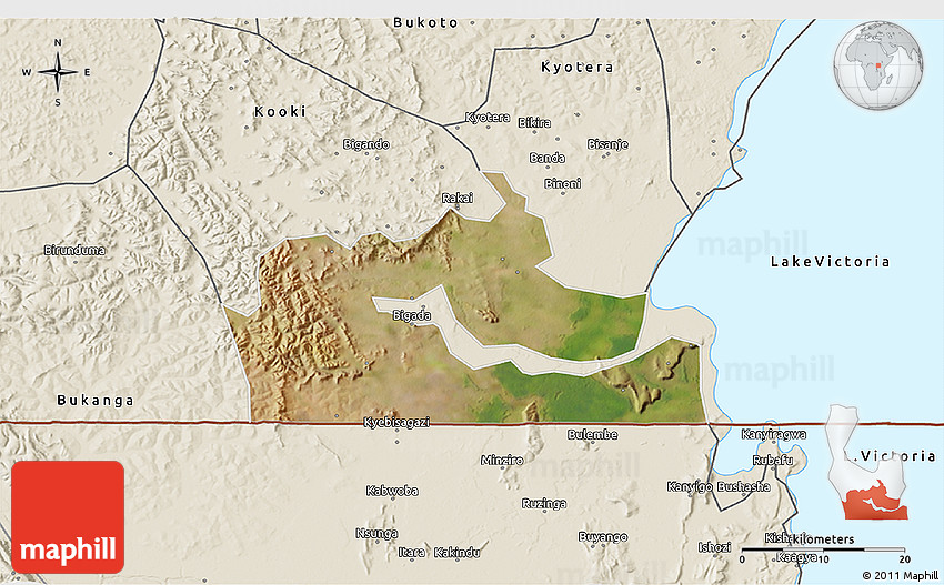 Shaded relief map shows landscape features, such as mountains, valleys and plateaus. Flat areas are smooth on the map, areas with steep slopes and mountains appear more rough. The above map of Kakuuto was created using a digital elevation model.