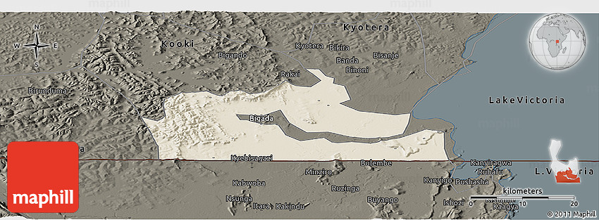 The panoramic shaded relief map represents one of several map types and styles available. Look at Kakuuto, Rakai, Uganda from different perspectives.