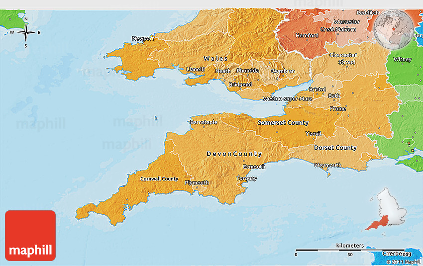 The 3D political shades map represents one of several map types and styles available. Look at South West, England, United Kingdom from different perspectives.