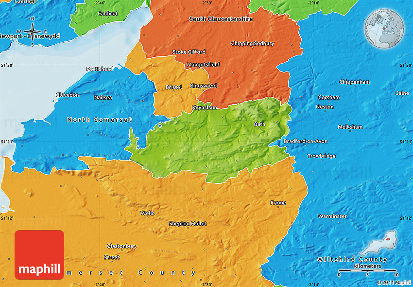 Each map style has its advantages. No map type is the best. The best is that Maphill lets you look at the whole area of Bath and North East Somerset from several different angles.
