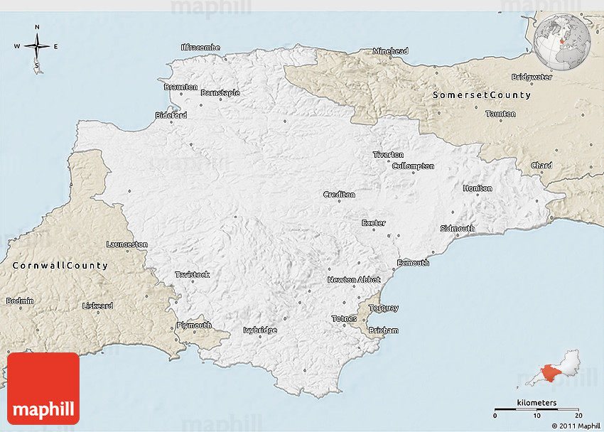 This map uses colors of vintage antique maps. Devon County is highlighted with white. The rest of the map is beige colored shaded relief map.