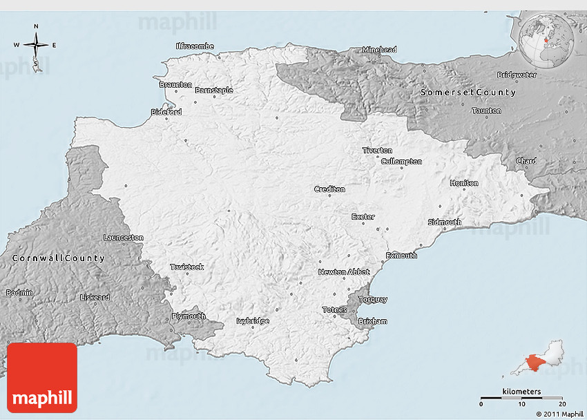 The grey colored map. Devon County is highlighted in white. This color scheme is similar to silver styled maps, but compared to the latter, a darker shade of gray is used.