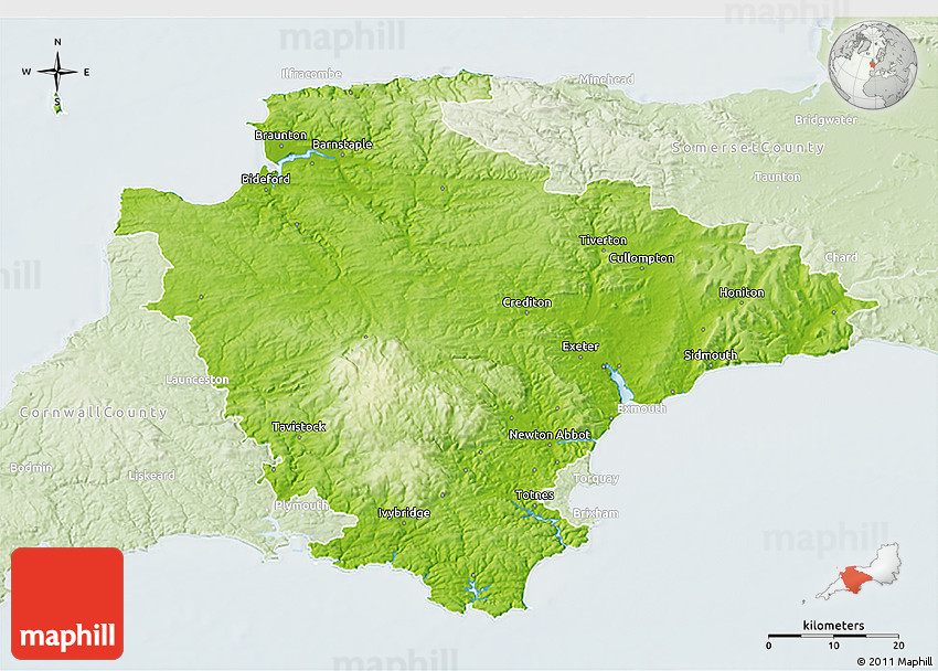 Physical map illustrates the mountains, lowlands, oceans, lakes and rivers and other physical landscape features of Devon County. Differences in land elevations relative to the sea level are represented by color.