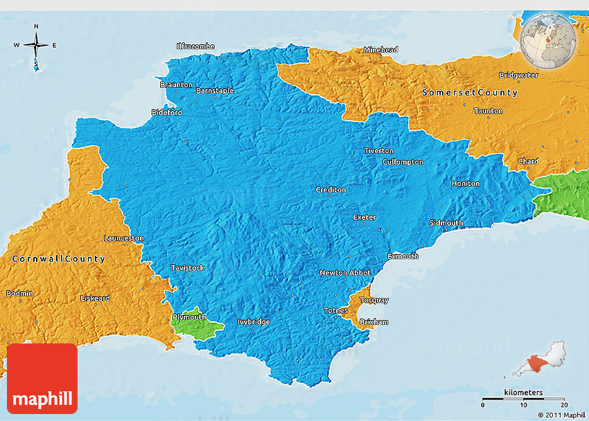 The 3D political map represents one of several map types available. Look at Devon County, South West, England, United Kingdom from different perspectives.