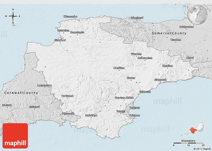 The 3D silver style map represents one of several map types available. Look at Devon County, South West, England, United Kingdom from different perspectives.