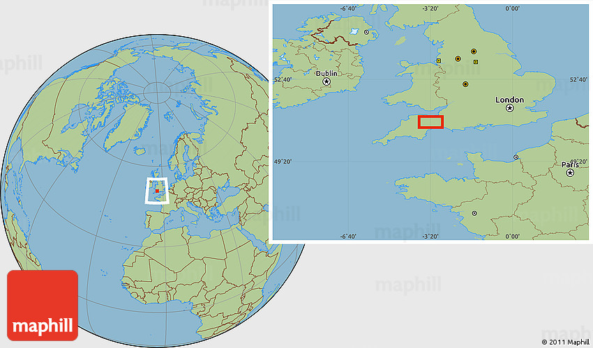 The location map of Honiton combines two projections: the orthographic azimuthal projection for the globe and the simple geographic projection for the rectangular part of the map. Geographic projection has straight meridians and parallels, each degree of latitude and longitude is the same size over the entire world map.