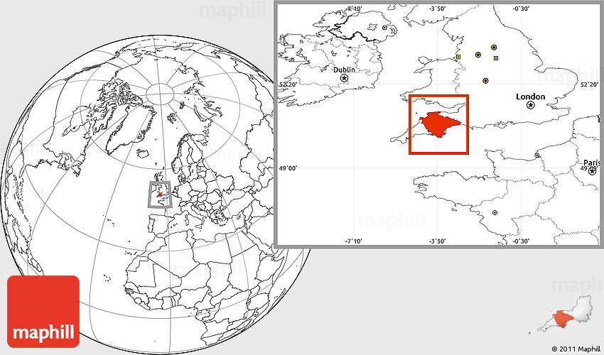 Maphill is a collection of map images. This image combines a blank map with the globe centered on Devon County. Use the buttons under the image to switch to different map types.