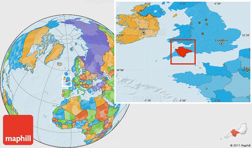 Maphill is a collection of map images. This image combines a political map with the globe centered on Devon County. Use the buttons under the image to switch to different map types.