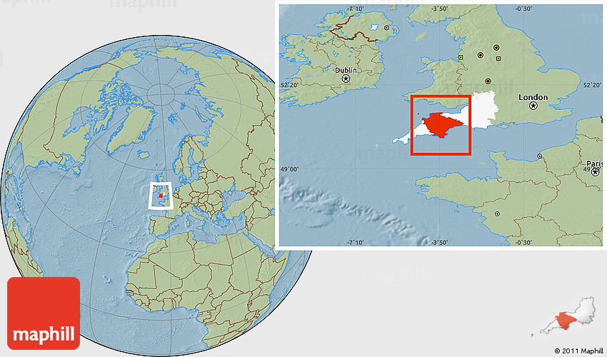 The location map of Devon County combines two projections: the orthographic azimuthal projection for the globe and the simple geographic projection for the rectangular part of the map. Geographic projection has straight meridians and parallels, each degree of latitude and longitude is the same size over the entire world map.