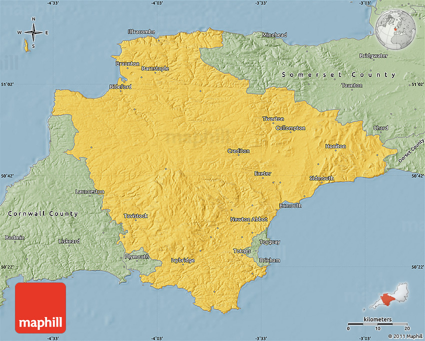 The flat savanna style map represents one of several map types available. Look at Devon County, South West, England, United Kingdom from different perspectives.