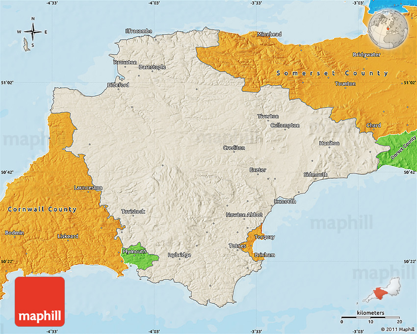 The flat shaded relief map represents one of several map types available. Look at Devon County, South West, England, United Kingdom from different perspectives.