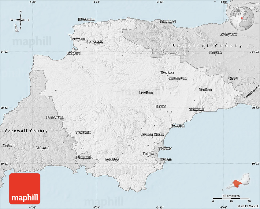 The flat silver style map represents one of several map types available. Look at Devon County, South West, England, United Kingdom from different perspectives.