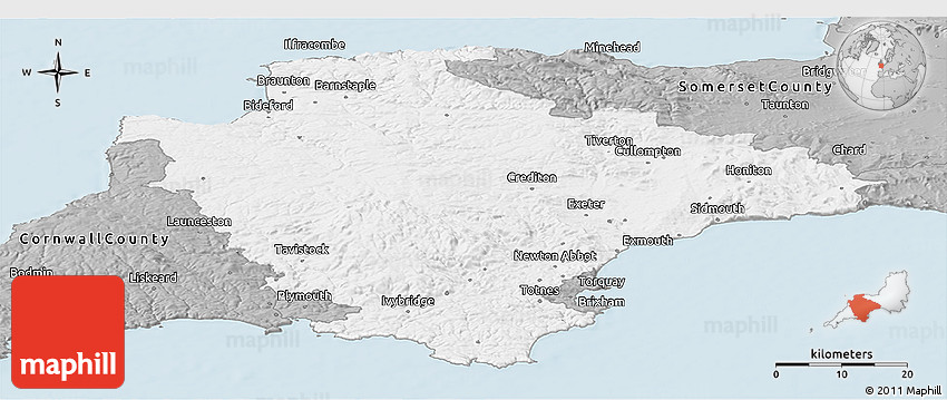 The grey colored map. Devon County is highlighted in white. This color scheme is similar to silver styled maps, but compared to the latter, a darker shade of gray is used.