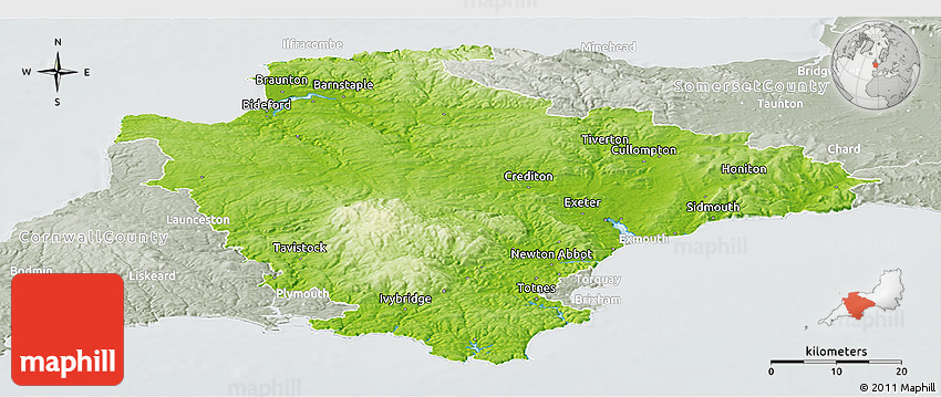 The panoramic physical map represents one of several map types available. Look at Devon County, South West, England, United Kingdom from different perspectives.