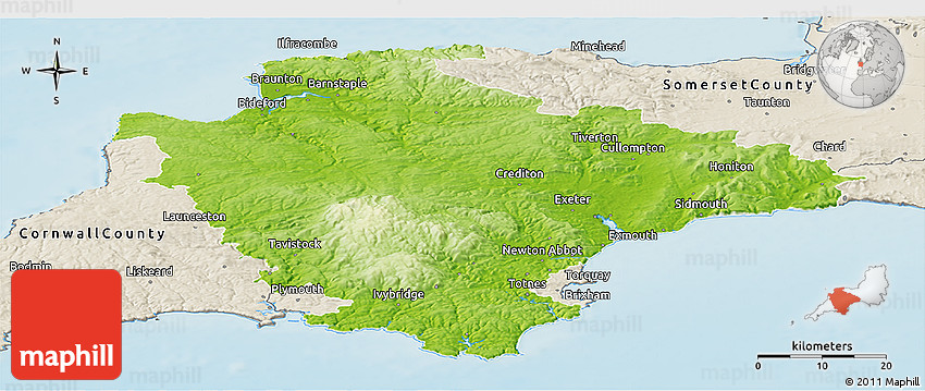 Physical map illustrates the mountains, lowlands, oceans, lakes and rivers and other physical landscape features of Devon County. Differences in land elevations relative to the sea level are represented by color.