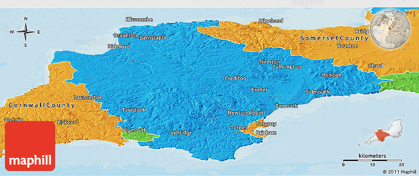 The panoramic political map represents one of several map types available. Look at Devon County, South West, England, United Kingdom from different perspectives.